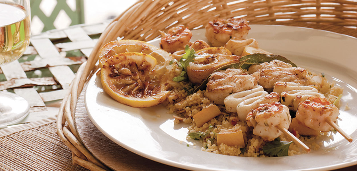 • Seafood Skewers with Lemon, Almond and Rocket Couscous