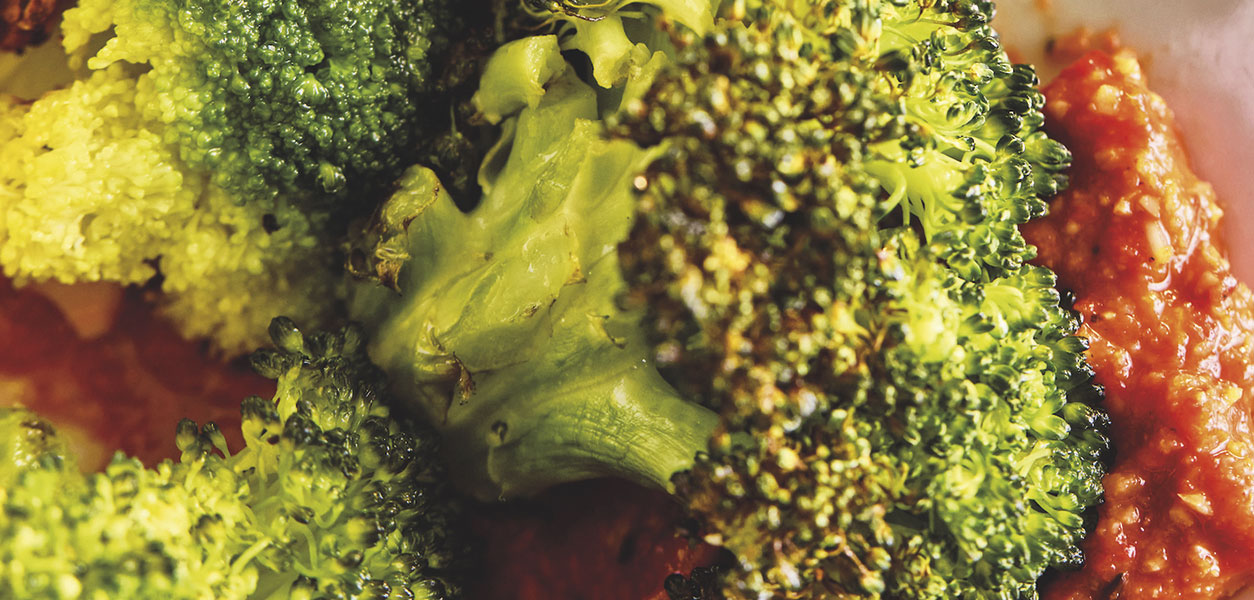 - Garlic Roasted Broccoli with Romesco Sauce and Toasted Almonds