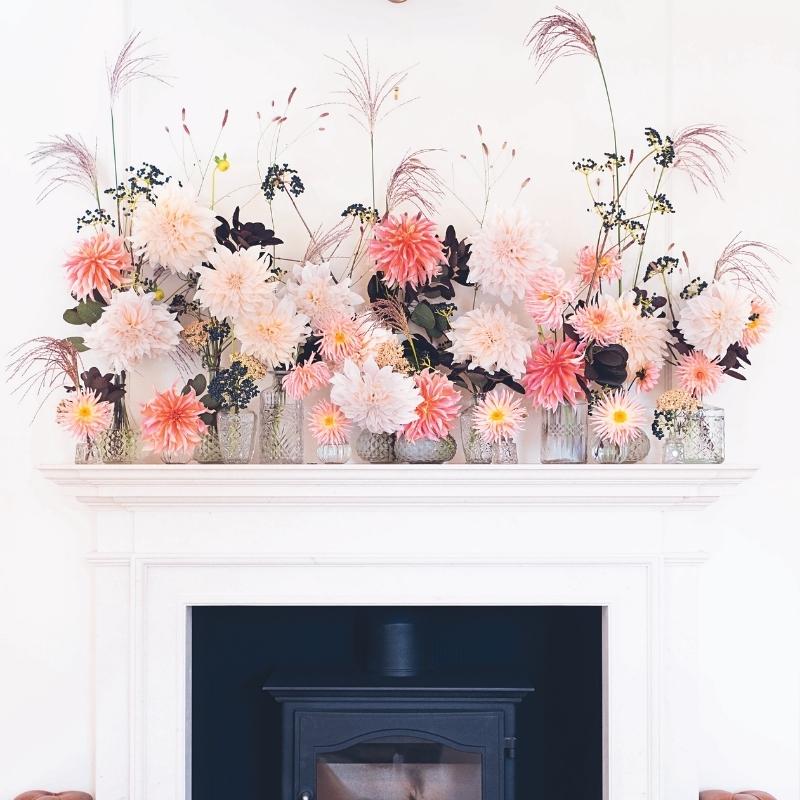 5: Add further Dahlia into the vases, playing with the contrasting shapes and structures, creating moments of interest and moments of pause along the mantle. I find the trick to a great mantelpiece display is to work in layers. With shorter stems placed at the front and taller stems placed at the back of the mantle, you will be able to achieve a real depth to your work.