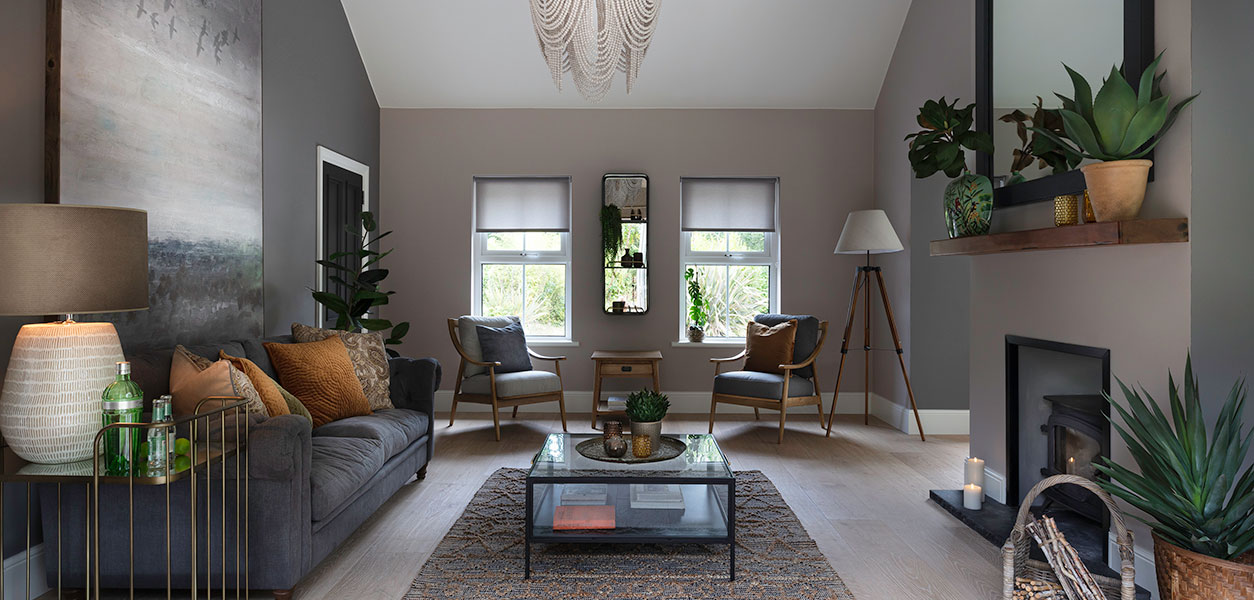 “The skirting in the living room and sunroom is painted Wimborne White by Farrow & Ball and the walls are a combination of Farrow & Ball Elephant’s Breath and Mole’s Breath.”