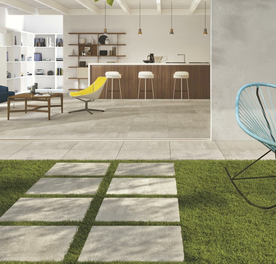 Armapave by Armatile – Seamless transitions from indoor to outdoor – Duplex Cementi Marfil 60x120x2cm pavers and 45x90cm tiles. Price on request.